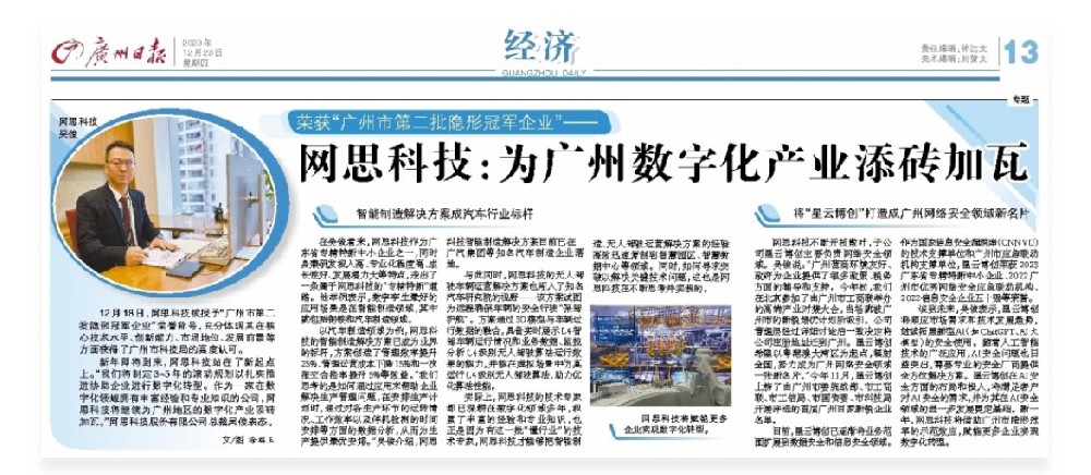 12月28日,《广州日报》经济板块报道了爱游戏体育(中国)官方网站_AYX SPORTS 的专题访问。总裁吴俊先生代表爱游戏体育(中国)官方网站_AYX SPORTS 接受采访,向读者分享了爱游戏体育(中国)官方网站_AYX SPORTS 的智慧解决方案以及子公司星云博创未来的发展规划。图为《广州日报》12月28日爱游戏体育(中国)官方网站_AYX SPORTS 专访版面荣获“广州市第二批隐形冠军企业”——爱游戏体育(中国)官方网站_AYX SPORTS :为广州地区的数字化产业添砖加瓦12月18日,爱游戏体育(中国)官方网站_AYX SPORTS 被授予“