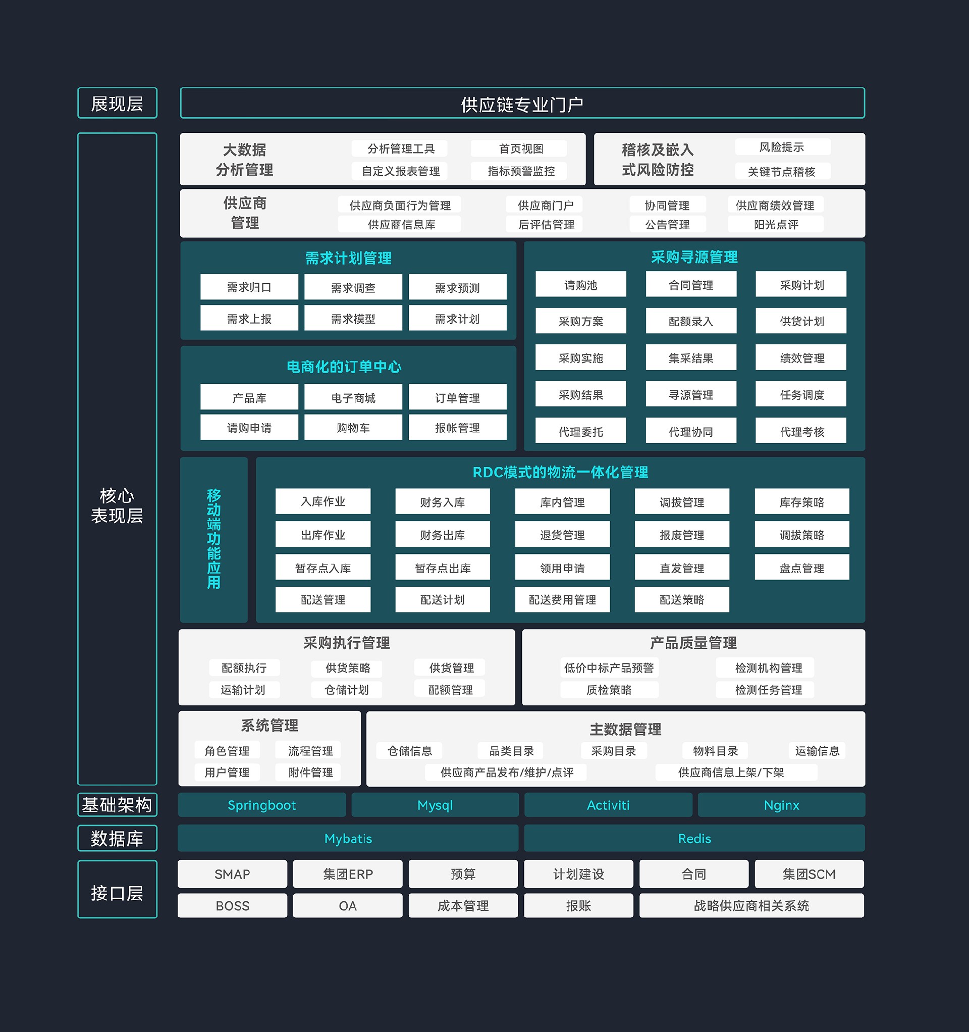 通过系统打通企业供应链管理的全过程,为大型集团和企业提供一体化供应链管理服务,纵向涵盖从集团总部集中化采购及大区业务,横向打通供应商及企业内部的其他业务系统,同时融入RPA、AI,区块链,大数据等新技术,为企业构建“横向到边、纵向到底”的智慧供应链生态圈 。
